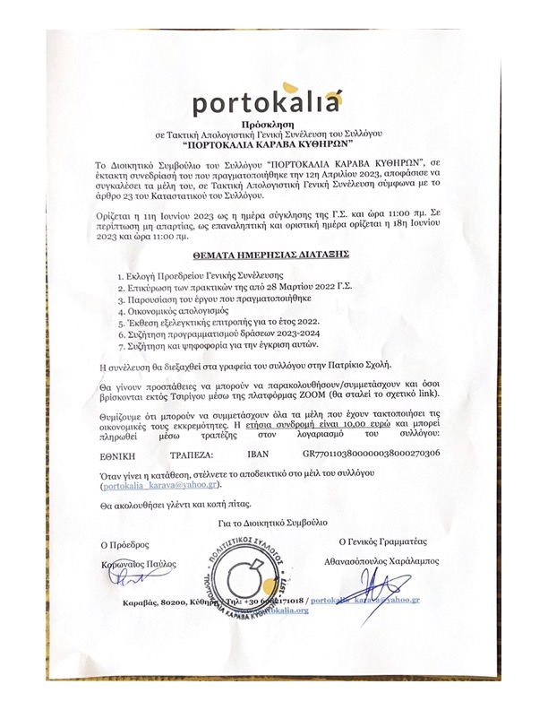 Το Διοικητικό Συμβούλιο του Συλλόγου “ΠΟΡΤΟΚΑΛΙΑ ΚΑΡΑΒΑ ΚΥΘΗΡΩΝ”, σε έκτακτη συνεδρίασή του που πραγματοποιήθηκε την 12η Απριλίου 2023, αποφάσισε να συγκαλέσει τα μέλη του, σε Τακτική Απολογιστική Γενική Συνέλευση σύμφωνα με το άρθρο 23 του Καταστατικού του Συλλόγου.