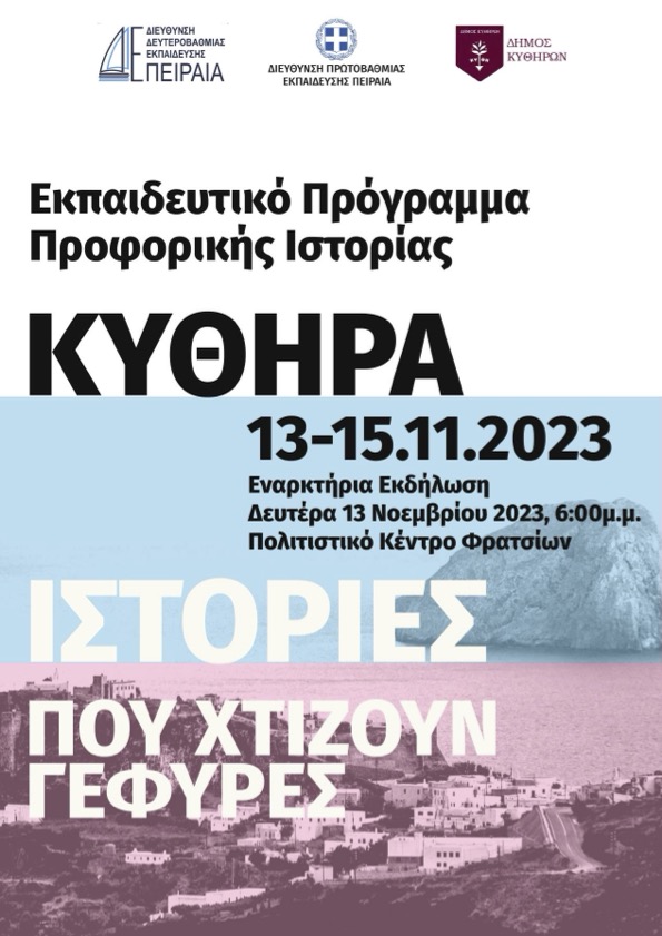 Ο Δήμος Κυθήρων και οι Διευθύνσεις Πρωτοβάθμιας και Δευτεροβάθμιας Εκπαίδευσης Πειραιά σας προσκαλούν στην έναρξη του προγράμματος προφορικής ιστορία «Κύθηρα: Ιστορίες που χτίζουν γέφυρες» τη Δευτέρα 13 Νοεμβρίου στις 6:00 μ.μ. στο Πολιτιστικό Κέντρο Φρατσίων.