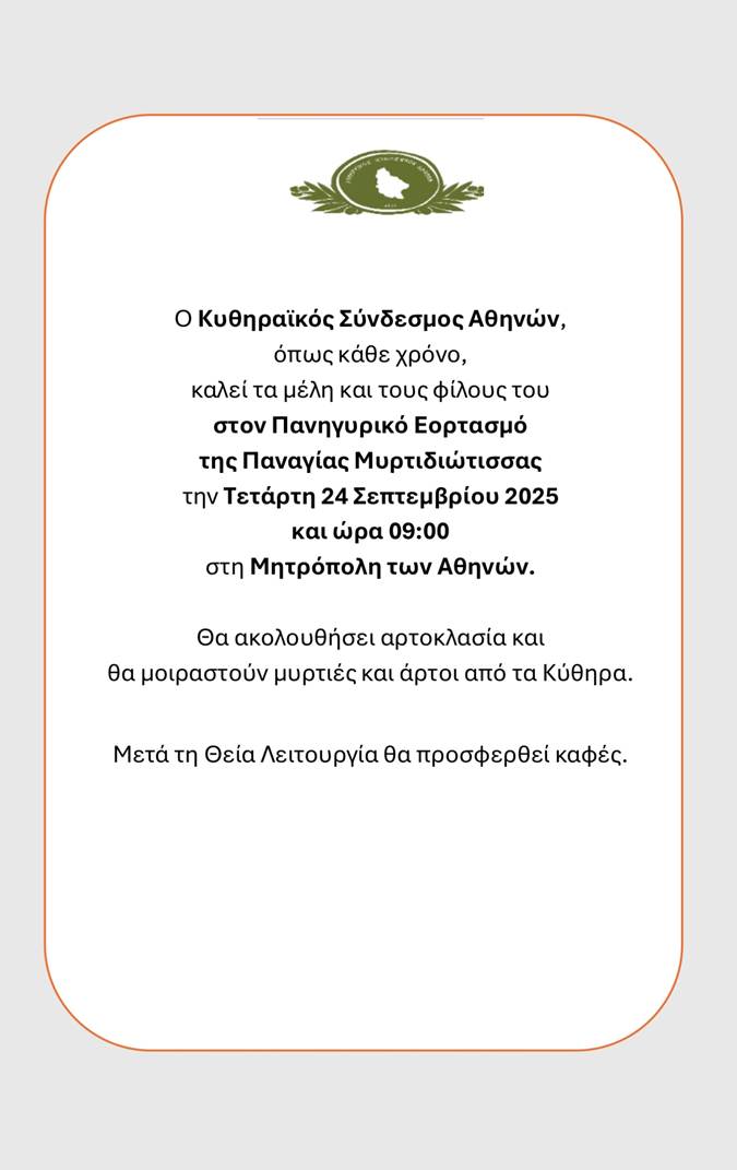 Πρόσκληση του Κυθηραΐκου Συνδέσμου στον εορτασμό της Μυρτιδιώτισσας στην Αθήνα