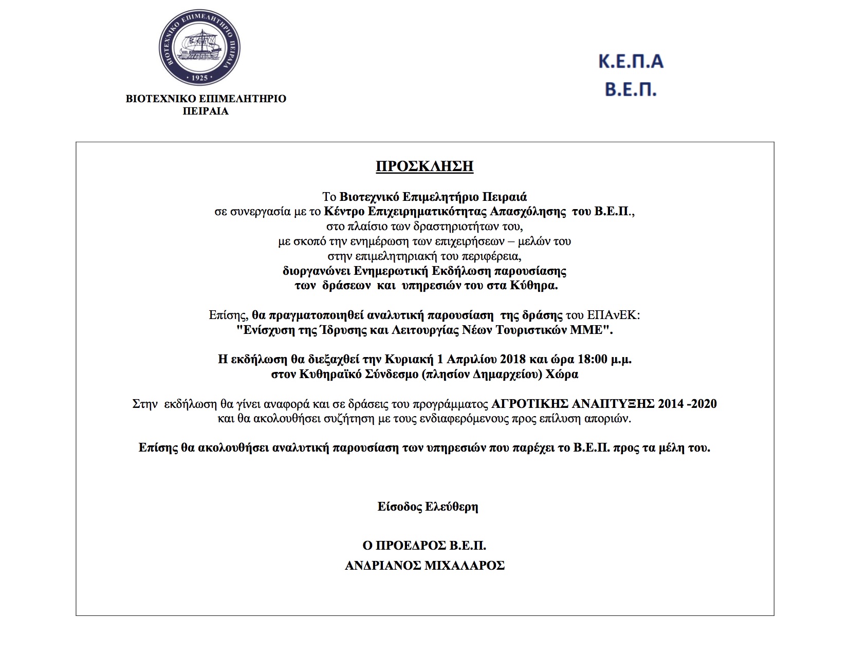 Πρόσκληση Βιοτεχνικού Επιμελητηρίου Πειραιά σε ενημερωτική εκδήλωση