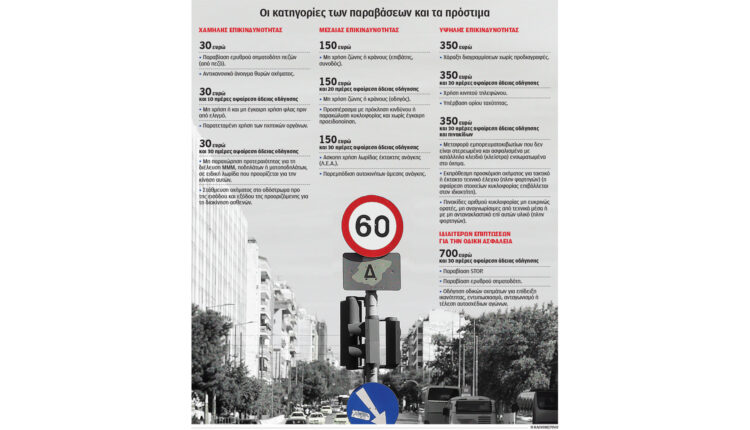 Ενδεικτικά, στην κατηγορία των παραβάσεων χαμηλής επικινδυνότητας ανήκουν η παραβίαση ερυθρού σηματοδότη από πεζό, στις μεσαίας επικινδυνότητας η υπέρβαση του ορίου ταχύτητας έως 20 χλμ./ώρα, καθώς και η μη χρήση ζώνης – κράνους από τον οδηγό. Το πρόστιμο σε αυτή την περίπτωση κινείται στα 150 ευρώ, ενώ αφαιρείται η άδεια για 20 ημέρες, όταν σήμερα το πρόστιμο είναι μηδενικό και προβλέπεται η αφαίρεση του διπλώματος αλλά και των πινακίδων για 60 ημέρες. Στις υψηλής επικινδυνότητας εντοπίζονται η χρήση του κινητού τηλεφώνου, αλλά και η υπέρβαση του ορίου ταχύτητας άνω των 30 χλμ./ώρα. Παράλληλα, βαρύ είναι το πρόστιμο για τις περιπτώσεις της παραβίασης του ερυθρού σηματοδότη, που αποτελεί μία από τις σημαντικότερες αιτίες πρόκλησης ακόμη και θανατηφόρων δυστυχημάτων. Σε περιπτώσεις υποτροπής, «τα πρόστιμα αυξάνονται γεωμετρικά», αναφέρουν πηγές με γνώση.