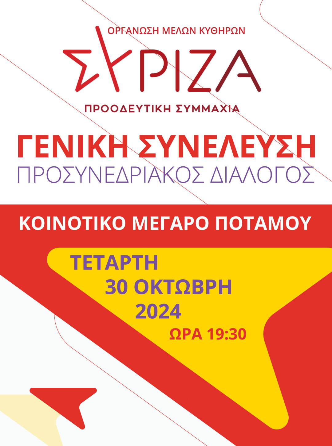Η Οργάνωση Μελών ΣΥΡΙΖΑ – Προοδευτική Συμμαχία Κυθήρων απευθύνει κάλεσμα συμμετοχής στη Γενική Συνέλευση – Προσυνεδριακό Διάλογο, που θα λάβει χώρα την Τετάρτη, 30 Οκτωβρίου 2024, στις 19:30, στο Κοινοτικό Μέγαρο Ποταμού.