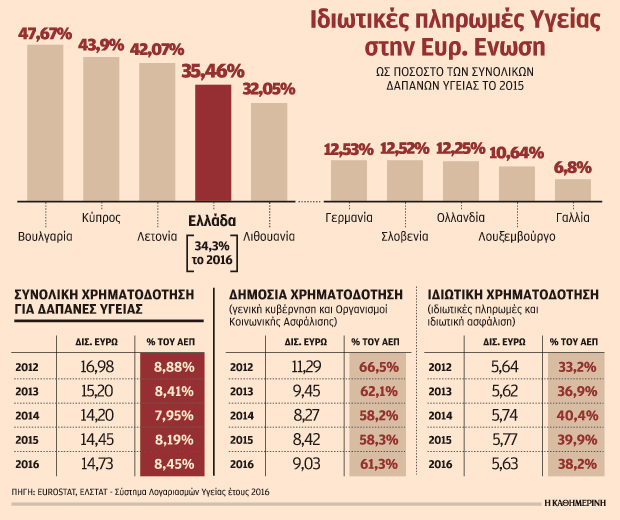 Σύμφωνα με τη Eurostat, η Ελλάδα είναι μεταξύ των χωρών με τις υψηλότερες ιδιωτικές πληρωμές υγείας, μετά τη Βουλγαρία (47,67% ιδιωτικές πληρωμές το 2015), την Κύπρο (43,9%) και τη Λετονία (42,07%). Στον αντίποδα βρίσκονται η Γαλλία, όπου οι λεγόμενες «out of pocket» δαπάνες είναι μόλις το 6,8% των συνολικών δαπανών υγείας, το Λουξεμβούργο (10,64%) και η Ολλανδία (12,25%).
