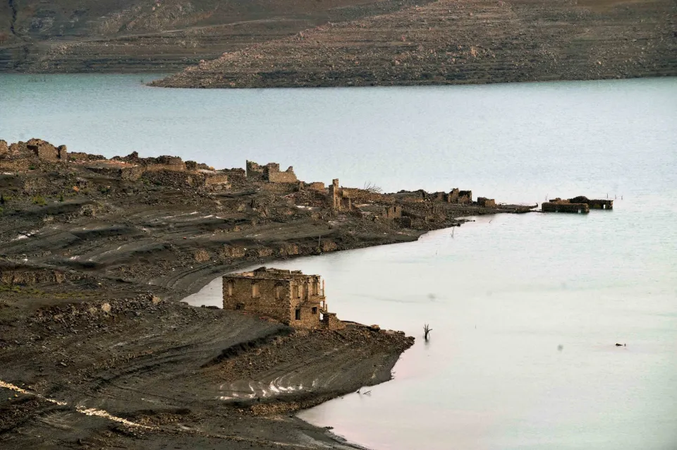 Ερείπια του χωριού Κάλλιο που έχει βυθιστεί στην Λίμνη του Μόρνου διακρίνονται στο στιγμιότυπο στις 28 Αυγούστου 2008