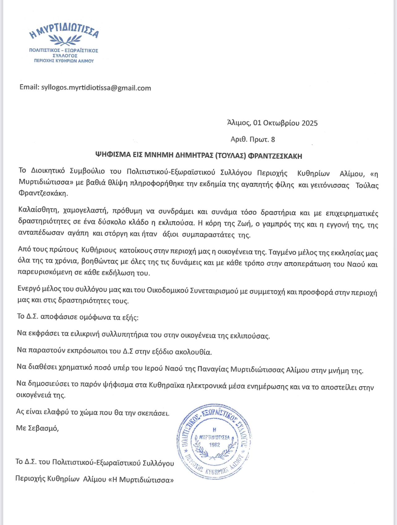 - Ψήφισμα εις μνήμη Δήμητρας Φραντζεσκάκη