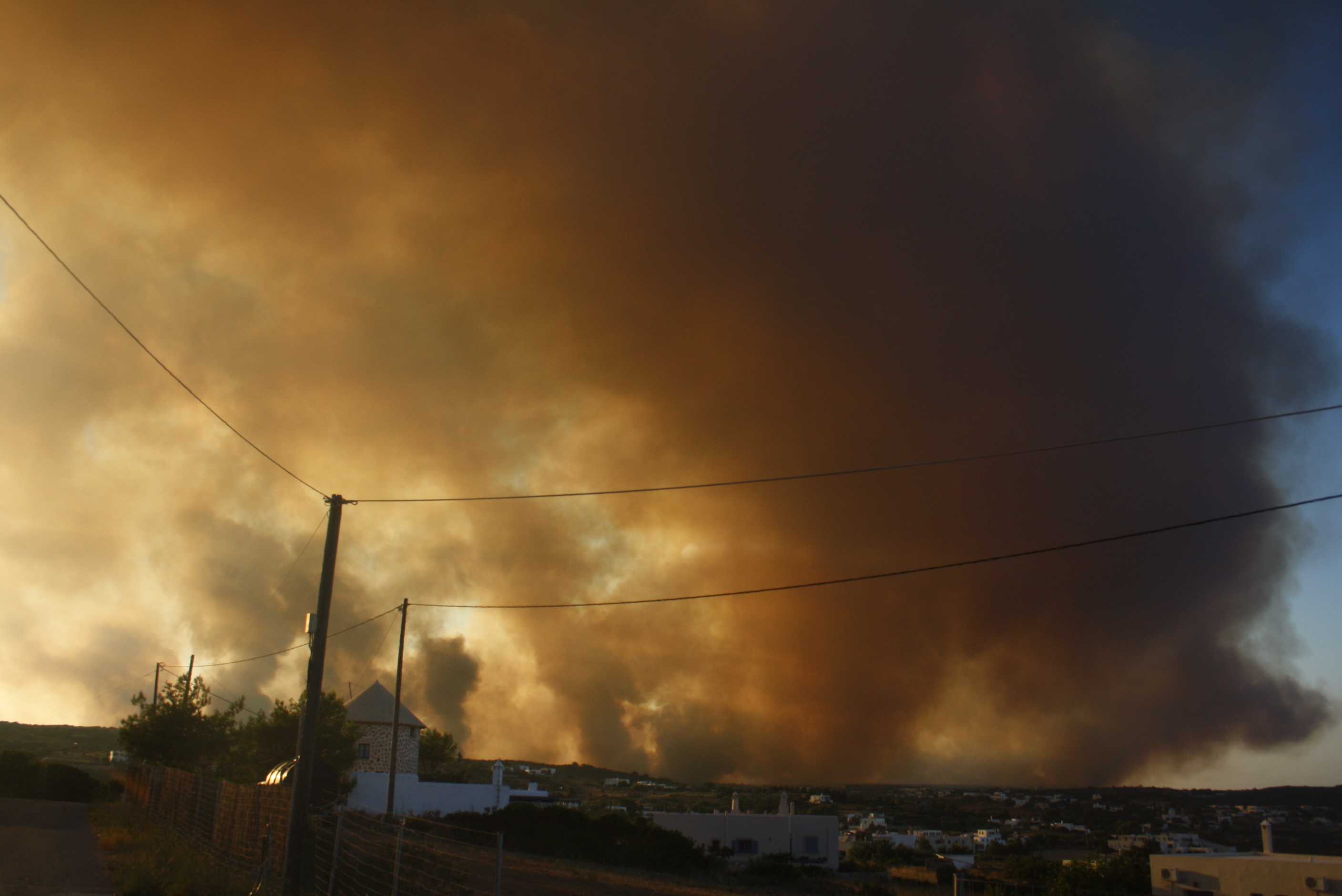 Με νεότερες πληροφορίες έχει ελεγχθεί το επικίνδυνο μέτωπο προς τα νότια και ανατολικά, ενώ υπάρχουν μικρές εστίες, στη δυτική πλευρά του νησιού σε απόκρυμνη περιοχή.