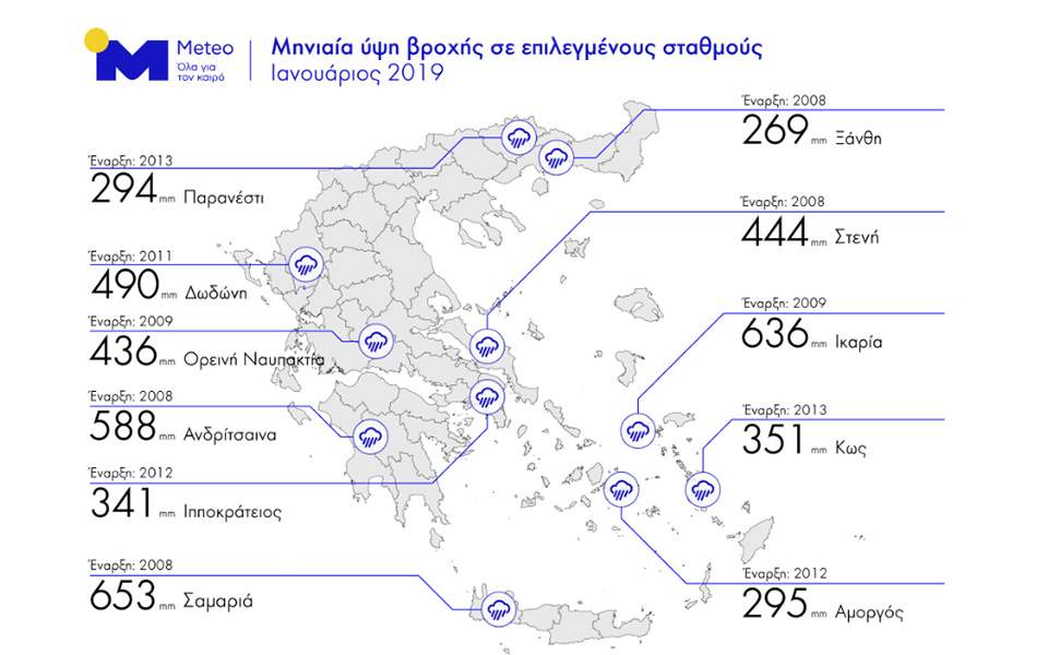 Πολύ μεγάλα ύψη βροχοπτώσεων καταγράφηκαν τον Ιανουάριο του 2019 σε ολόκληρη σχεδόν την Ελλάδα, σύμφωνα με την μετεωρολογική υπηρεσία meteo του Εθνικού Αστεροσκοπείου Αθηνών (ΕΑΑ).