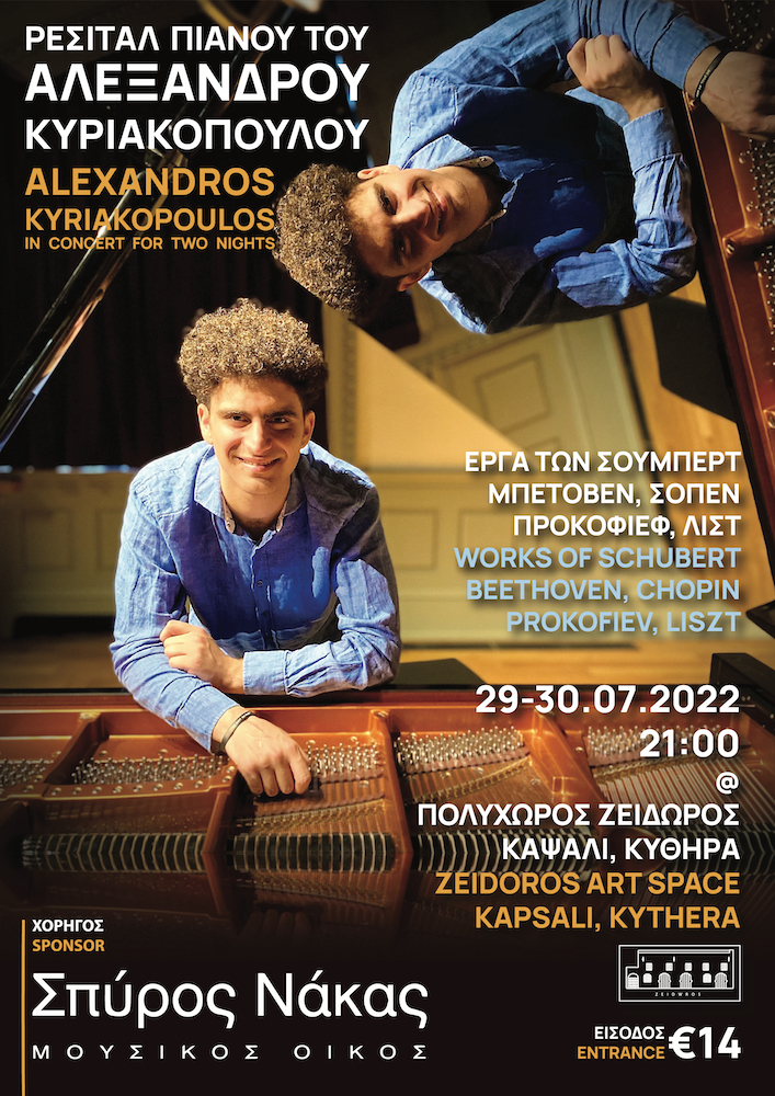 Ο πιανίστας Αλέξανδρος Κυριακόπουλος σας προσκαλεί σε δυο βραδιές κλασικής μουσικής που θα διεξαχθούν στο μοναδικό αμφιθέατρο του πολυχώρου «Ζείδωρος» στο Καψάλι Κυθήρων.