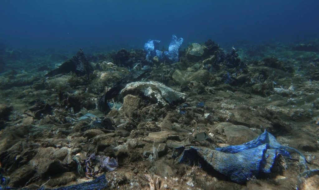 Σαν απόκοσμο γλυπτό, μία μπλε πλαστική σακούλα ορθώνεται στον βυθό, από τον σορό των σκουπιδιών