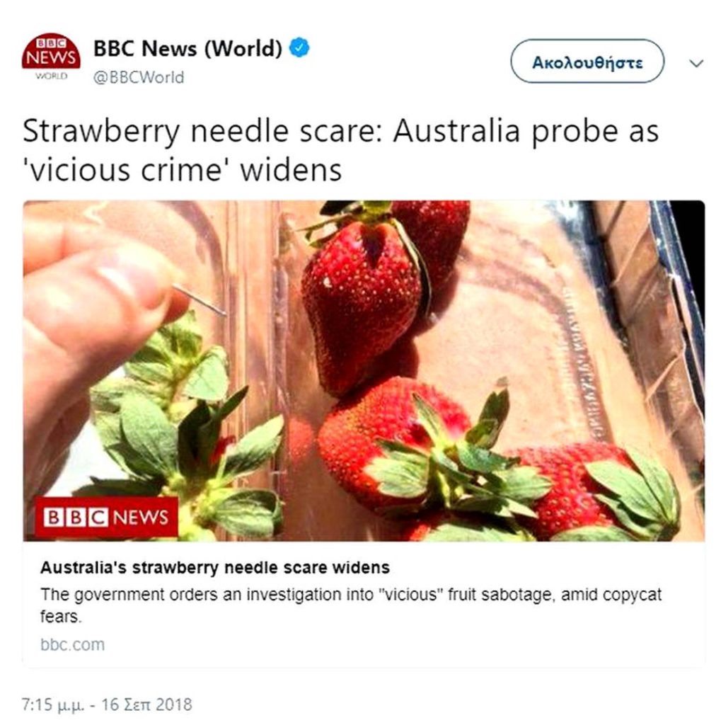 Στην επικαιρότητα βρίσκεται μια τρομακτική υπόθεση που εκτυλίσσεται στην Αυστραλία, όπου οι Αρχές διέταξαν τη διεξαγωγή έρευνας καθώς βρέθηκαν βελόνες ραψίματος κρυμμένες σε φράουλες και μπανάνες. Καλαθάκια με φρούτα που είχαν βελόνες αναφέρθηκαν σε 6 πολιτείες.
