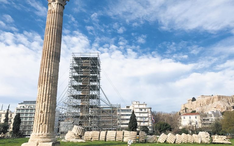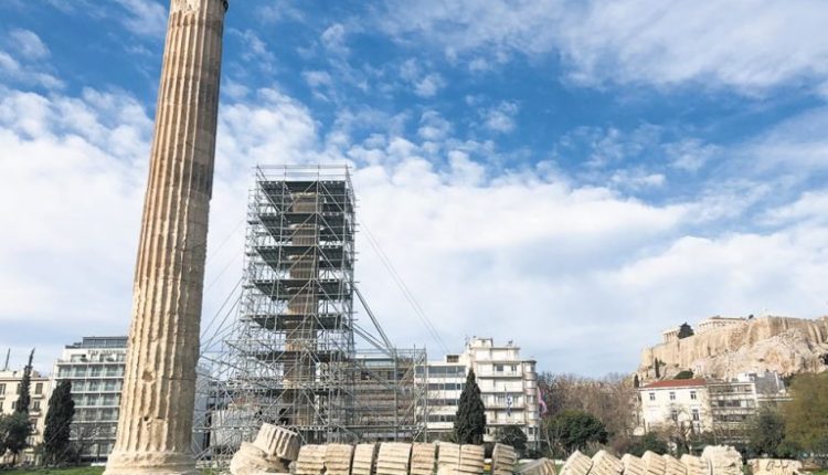 Ενα από τα πιο δύσκολα αλλά και σημαντικά έργα συντήρησης ξεκινάει η Εφορεία Αρχαιοτήτων Πόλης Αθηνών στον ναό του Ολυμπίου Διός, στην καρδιά της πρωτεύουσας. Ο κίονας των 17 μέτρων στο δυτικό άκρο του ναού που «ντύθηκε» με το προστατευτικό ικρίωμα είναι ο πρώτος και θα ακολουθήσουν και οι υπόλοιποι στο πλαίσιο του προγράμματος στερέωσης και συντήρησης του μνημείου από τις σοβαρές φθορές που έχει υποστεί με το πέρασμα των αιώνων. Δεν ήταν μόνο τα χρυσελεφάντινα αγάλματα του Δία και του αυτοκράτορα Αδριανού ή τα αναθήματα του περιβόλου που προκαλούσαν εντύπωση στον ναό του Ολυμπίου Διός στην Αθήνα, αλλά η μεγαλοπρέπειά του οφειλόταν κατά κύριο λόγο στο μεγάλο μέγεθός του. Με μήκος 110 μέτρων, πλάτος 43 μέτρων και ύψος 17 μέτρων, ο ναός του Δία ήταν από τους μεγαλύτερους του αρχαίου κόσμου, εφάμιλλος, όπως μας είπε η αρχαιολόγος και προϊσταμένη της ΕΦΑ Αθηνών Ελένη Μπάνου, με τους ναούς που έχτιζαν οι τύραννοι της Μικράς Ασίας τον 6ο αι. π.Χ.
