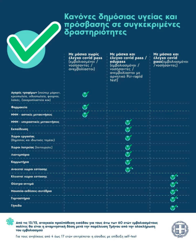Επίσης υπενθυμίζεται ότι από τις 13/12 αναγκαία προϋπόθεση εισόδου για τους άνω των 60 ετών εμβολιασμένους πολίτες θα είναι η αναμνηστική δόση μετά την παρέλευση 7μήνου από την ολοκλήρωση του εμβολιασμού.