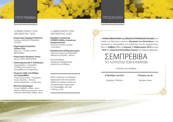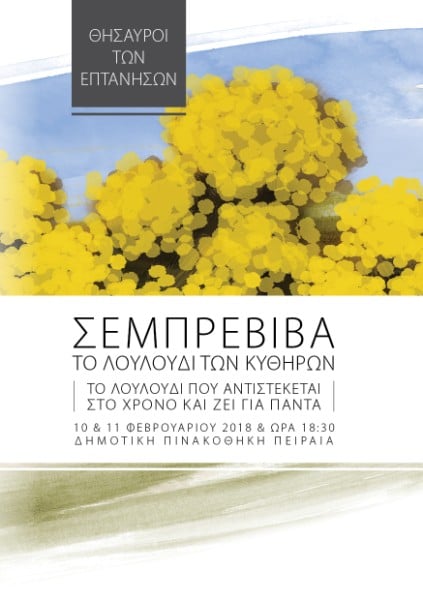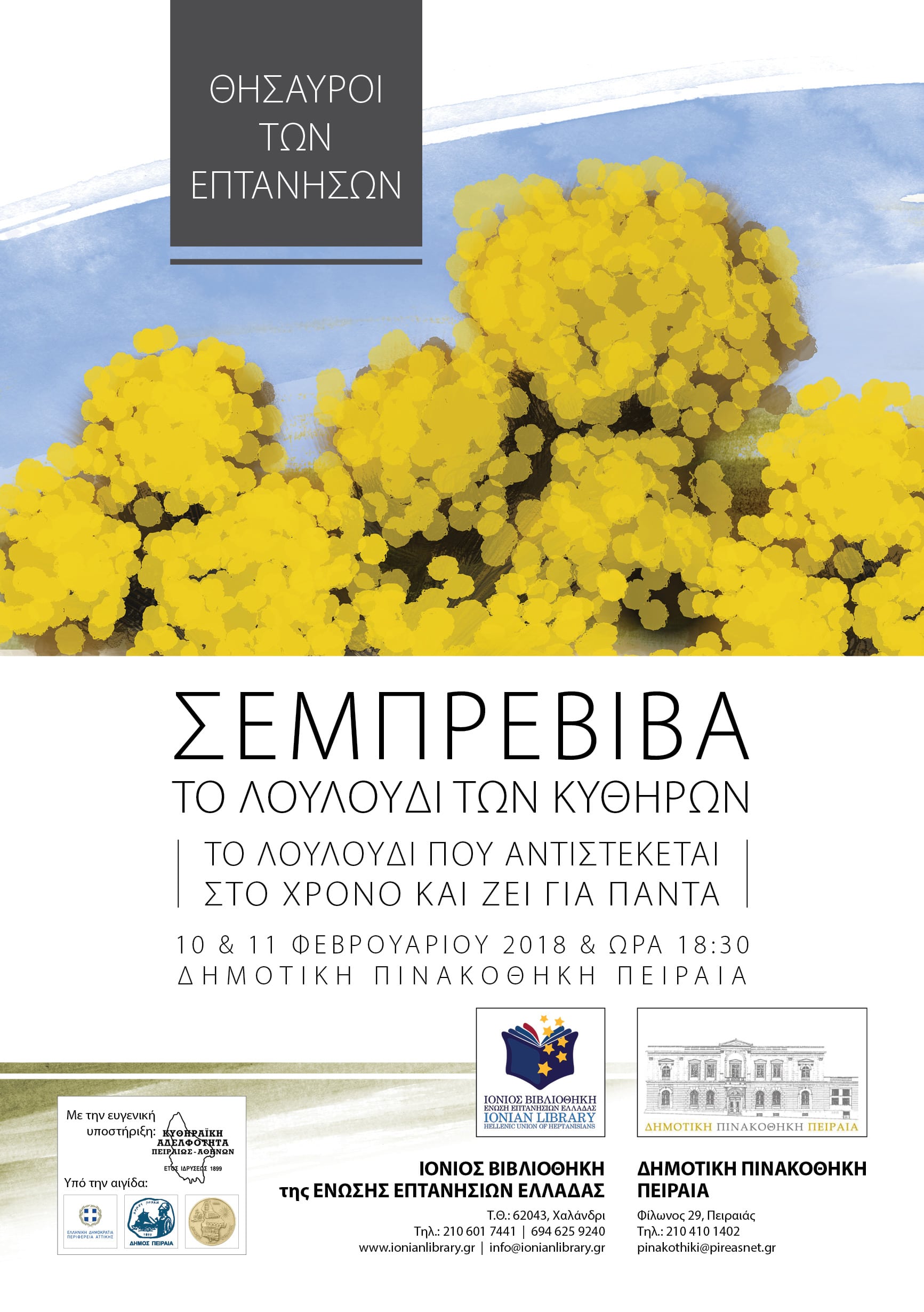 Η ΙΟΝΙΟΣ Βιβλιοθήκη της ΕΝΩΣΗΣ ΕΠΤΑΝΗΣΙΩΝ ΕΛΛΑΔΑΣ, στο πλαίσιο της θεματικής σειράς «Θησαυροί των Επτανήσων», διοργανώνει ποικίλες εκδηλώσεις αφιερωμένες στο αιώνιο άνθος, την «Σεμπρεβίβα – το λουλούδι των Κυθήρων», οι οποίες θα πραγματοποιηθούν το Σάββατο 10 & την Κυριακή 11 Φεβρουαρίου 2018 και ώρα 18:30 στη Δημοτική Πινακοθήκη Πειραιά.