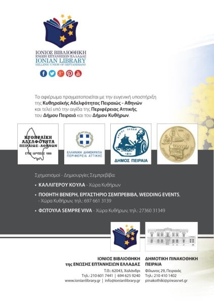 Το αφιέρωμα πραγματοποιείται με την ευγενική υποστήριξη της Κυθηραϊκής Αδελφότητας Πειραιώς – Αθηνών και τελεί υπό την αιγίδα της Περιφέρειας Αττικής, του Δήμου Πειραιά και του Δήμου Κυθήρων.