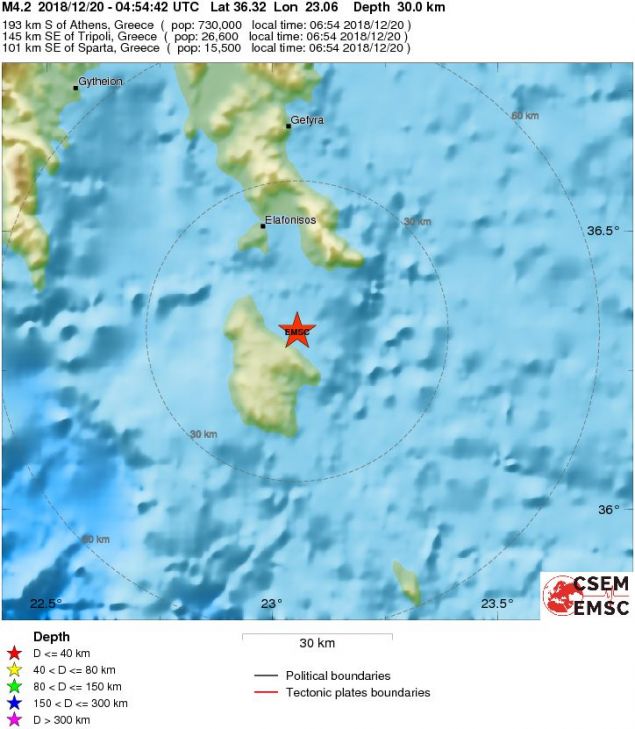 H προκαταρκτική αυτόματη λύση του Γεωδυναμικού Ινστιτούτου του Αστεροσκοπείου Αθηνών δίνει το σεισμό στα 4,0 Ρίχτερ, με εστιακό βάθος τα 5χλμ, και επίκεντρο 15χλμ. βορειοανατολικά των Κυθήρων.