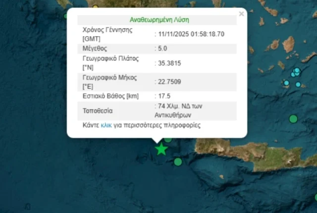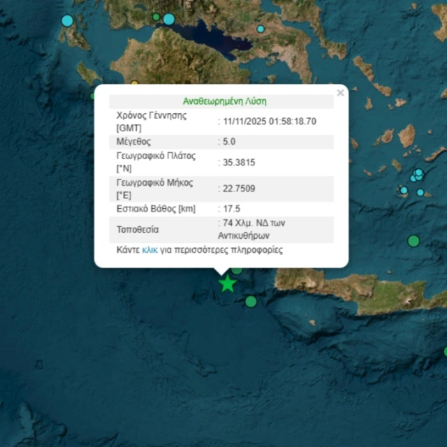 Σεισμική δόνηση μεγέθους 5 βαθμών της κλίμακας Ρίχτερ σημειώθηκε λίγο πριν τις 4 τα ξημερώματα της Τρίτης στα ανοιχτά των Αντικυθήρων.