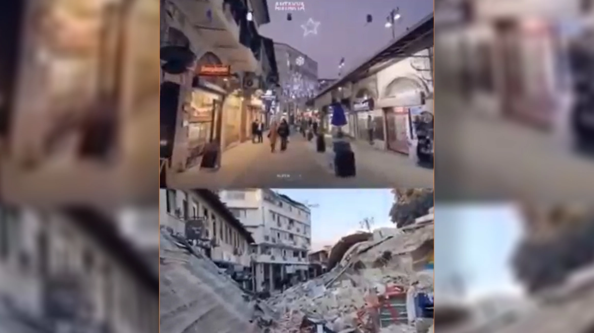 Τις τελευταίες ώρες κάνει τον γύρο του διαδικτύου είνα βίντεο στο οποίο απεικονίζεται η κεντρική αγορά της Αντιόχειας, στην επαρχία Χατάι, πριν και μετά το φονικό χτύπημα του Εγκέλαδου που άφησε πίσω τους χιλιάδες νεκρούς, τραυματίες και αγνοούμενους τόσο στην νοτιοανατολική Τουρκία όσο και στη βόρεια Συρία.