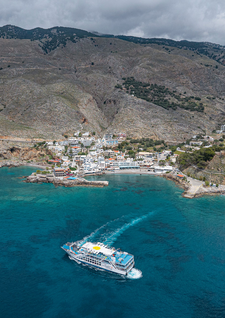Φροντίζει γι’ αυτό η ΑΝΕΝΔΥΚ, η πολυμετοχική εταιρεία λαϊκής βάσης που με τα πλοία «Δασκαλογιάννης» (Χώρα – Λουτρό – Αγία Ρουμέλη – Σούγια – Παλαιόχωρα) και «Σαμαριά» (επιδοτούμενο, που συνδέει τη Γαύδο με τη γραμμή) στοχεύει στη στήριξη της περιοχής. «Θέλουμε να κρατήσουμε τους ντόπιους και τους νέους στα Σφακιά, να φέρνουμε επισκέπτες, να νιώθουν οι άνθρωποι ότι έχουν λόγο να μείνουν σε αυτόν τον τόσο προνομιούχο τόπο», μας λέει ο Στράτος Μπουρνάζος, καπετάνιος και πρόεδρος της εταιρείας, με καταγωγή από τον Αποκόρωνα, που ήρθε στα Σφακιά ως γαμπρός το 1986. «Αυτό το τοπίο με συνεπαίρνει ακόμη. Ψηλά βουνά και θάλασσα μαζί», τονίζει, επισημαίνοντας ωστόσο το μεγαλύτερο πρόβλημα της περιοχής, τα λιμάνια. «Σε Παλαιόχωρα και Σφακιά είναι αλιευτικά καταφύγια, στο Λουτρό είναι απλώς ένας απάνεμος όρμος με μια προβλήτα, για την Αγία Ρουμέλη δεν το συζητώ».