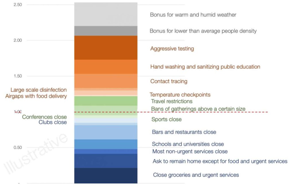 Στο διάγραμμα 2 (αντιγραφή από την εξαιρετική ανάρτηση του Tomas Pueyo the Hammer & the Dance) οπτικοποιείται ο μηχανισμός μείωσης του ρυθμού μετάδοσης R0. Παρακαλώ σημειώστε ότι τα νούμερα στο διάγραμμα είναι εντελώς τυχαία/ενδεικτικά. Ακόμη και ο μηχανιστικός επιμερισμός των διαφόρων παραγόντων μείωσης του R0 είναι απλουστευτικός και ανακριβής. Δείτε το διάγραμμα ως παράδειγμα για την κατανόηση του επιλογών που έχουμε.