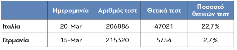 Στην Ιταλία, όπου η εξάπλωση της επιδημίας είναι πολύ πιο προχωρημένη, τα τεστ μόλις που επαρκούν για τον έλεγχο ασθενών με σοβαρά συμπτώματα, ενώ στη Γερμανία ο ίδιος αριθμός τεστ επαρκεί για τον έλεγχο πολύ ευρύτερης περιμέτρου ασθενών, συμπεριλαμβανομένων εκείνων με ήπια συμπτώματα ή και ασυμπτωματικών. Η διαφορά στη συχνότητα/μεθοδολογία αντανακλάται στο πολύ χαμηλότερο % θετικών τεστ της Γερμανίας. (Πίνακας 1)