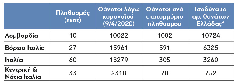 Το παράδειγμα της Ιταλίας (πίνακας 2) είναι διαφωτιστικό: Η Λομβαρδία μετρά 15 φορές περισσότερους νεκρούς (ανά εκατ. κατοίκων) από την Κεντρική & Νότια Ιταλία.