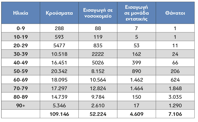 - 6 θάνατοι σε 270 κρούσματα στις ηλικίες 70-79 ετών αντιστοιχούν σε θνητότητα 2,2%.