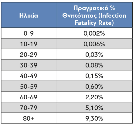 - 1 θάνατος σε 200 κρούσματα στο ηλικιακό φάσμα 60-69 ετών αντιστοιχεί σε θνητότητα 0,5%.