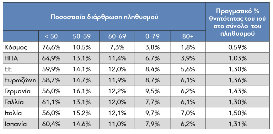 Πίνακας 5: Ηλικιακή κατανομή πληθυσμού και μέση πραγματική θνητότητα του ιού στο σύνολο του πληθυσμού. Πηγή Eurostat, ΟΗΕ.
