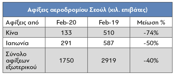 Στον πίνακα βλέπουμε στοιχεία αφίξεων στο αεροδρόμιο της Σεούλ εδώ για το μήνα Φεβρουάριο 2020 vs 2019. (Στοιχεία για το Μάρτιο δεν είναι ακόμα διαθέσιμα).