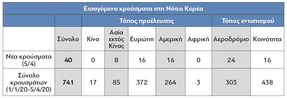 Πίνακας 8: Εισαγόμενα κρούσματα στη Νότια Κορέα α) νέα εισαγόμενα κρούσματα βεβαιωθέντα την 5η Απριλίου β) σύνολο εισαγόμενων κρουσμάτων έως την 5η Απριλίου. Πηγή KCDC.