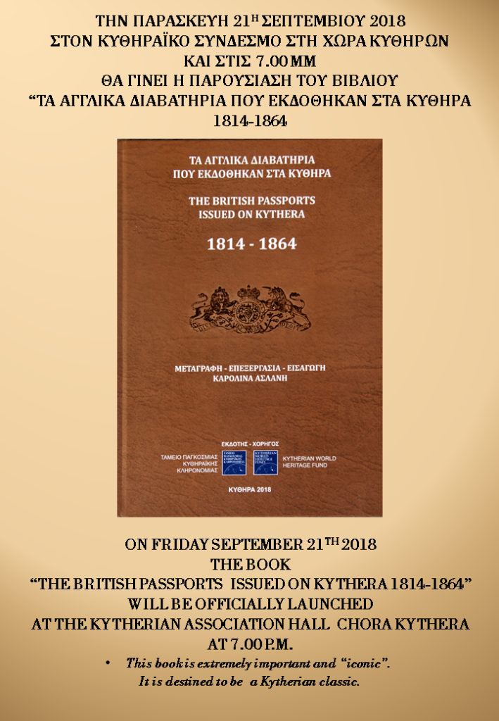 Σήμερα στη Χώρα η παρουσίαση του βιβλίου “Τα Αγγλικά διαβατήρια που εκδόθηκαν στα Κύθηρα 1814-1864”