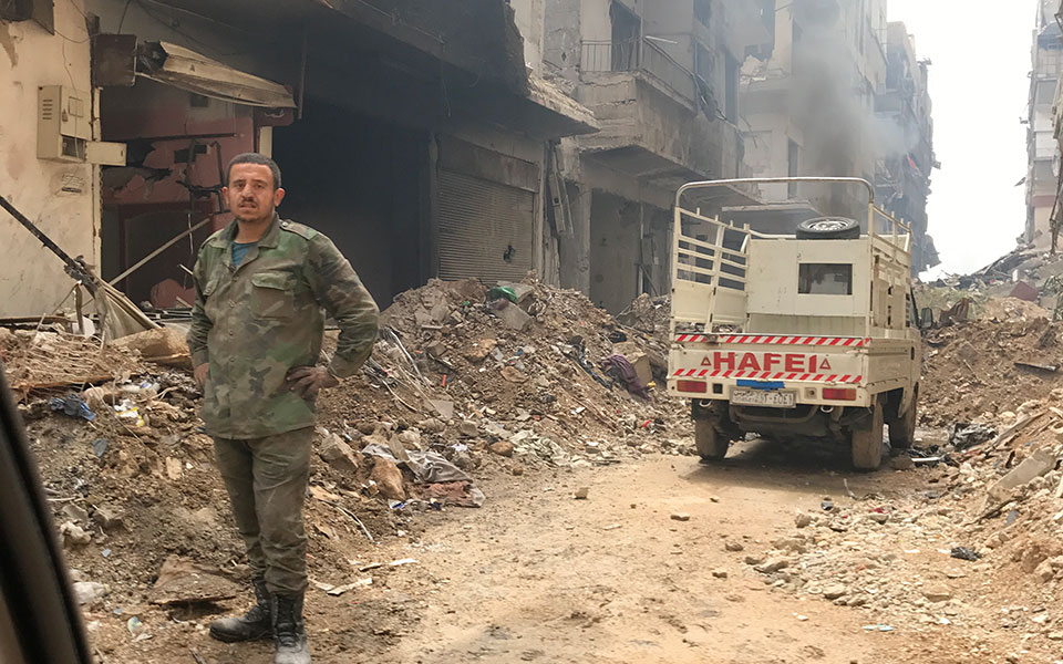 Την ημέρα της συνέντευξης αφήσαμε τα «πράγματά» μας πίσω και ξαναπήγαμε στο Προεδρικό. Από εκεί, σεμνά και ταπεινά με ένα ΚΙΑ αρχίσαμε να ξανακατεβαίνουμε προς την πόλη. Κάποια στιγμή αντικρίσαμε ένα καλά –αλλά όχι υπερβολικά– φυλαγμένο κτίριο, που έμοιαζε με σατό σε κάποια γαλλική επαρχία. Οι φρουροί ήταν όλοι με πολιτικά και πάντα με… καλάσνικοφ. Η πόρτα άνοιξε και ναι, μας υποδέχθηκε ο ίδιος ο Ασαντ. Στην αρχή ήταν κάπως αμήχανος και μας εξήγησε ότι είχε πολύ καιρό να δώσει συνέντευξη, παρά το γεγονός ότι έχει πολλά αιτήματα. Εβγαζε γενικά μιαν αίσθηση ότι ο υπόλοιπος κόσμος δεν τον «καταλαβαίνει». Εξομολογήθηκε ότι με τους Aμερικανούς δεν μπορεί να συνεννοηθεί καν γιατί ο πρόεδρος αλλάζει γνώμη τρεις φορές την ημέρα. Ακολούθησε η συνέντευξη και μετά ζητήσαμε να πάμε στην πρώτη γραμμή, νοτίως της Δαμασκού. Ετσι όπως μας τέθηκε το ζήτημα πιστέψαμε ότι θα είχαμε συνοδεία στρατού, ίσως και κάποια θωρακισμένα αυτοκίνητα. Φτάσαμε στο μέτωπο με ένα πολύ παλιό τζιπ που οδηγούσε ένας αξιωματικός και το ΚΙΑ. Επειτα από δύο μπλόκα, αντικρίσαμε την κόλαση. Μια oλόκληρη συνοικία γκρεμισμένη σε απίστευτο σημείο. Δεξιά και αριστερά, ήταν κρεμασμένα μεγάλα πανιά για να μην έχουν οπτική επαφή οι τζιχαντιστές-ελεύθεροι σκοπευτές. Κάθε λίγο ακουγόταν μία έκρηξη. Ο επικεφαλής στρατιωτικός είχε ένα πρόχειρο γραφείο, με ένα νοσοκομειακό κρεβάτι πίσω του και ένα… καλάσνικοφ πάνω στο μαξιλάρι. Ηταν πολύ σαφής. Οποιος έπρεπε ή μπορούσε, είχε φύγει από τη συνοικία-φάντασμα. Αυτοί που είχαν μείνει δεν είχαν πουθενά να πάνε, θα φύγουν μόνο νεκροί. Οταν άκουσα μία έκρηξη, τον ρώτησα τι ήταν. Απάντησε με ένα μειδίαμα. «Ακούσατε κάτι; Δεν το πήρα χαμπάρι».