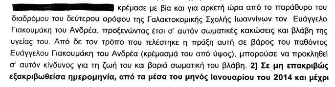 Αλλη μέρα, έξι από τους κατηγορουµένους, ενώ βρίσκονταν στη Γαλακτοκοµική Σχολή Ιωαννίνων, τον ωθούσαν βίαια και «τον χτυπούσαν αιφνιδιαστικά και µε σφοδρότητα στον αυχένα, τον τράχηλο και το πρόσωπό του».