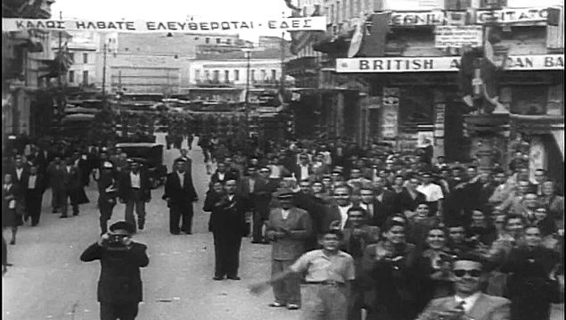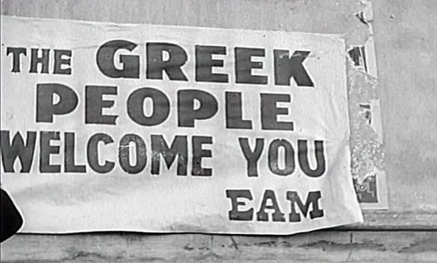 Σε άλλη φωτογραφία, βλέπουμε πανό του ΕΛΑΣ, που καλωσορίζει επίσης τους Βρετανούς, γράφοντας μάλιστα στην αγγλική γλώσσα: Ο ΕΛΛΗΝΙΚΟΣ ΛΑΟΣ ΣΑΣ ΚΑΛΩΣΟΡΙΖΕΙ –ΕΑΜ. Δεξιοί και αριστεροί, είναι ενωμένοι, αυτές τις μέρες της χαράς, που δυστυχώς, θα τις ακολουθήσει η εμφυλιοπολεμική καταιγίδα.
