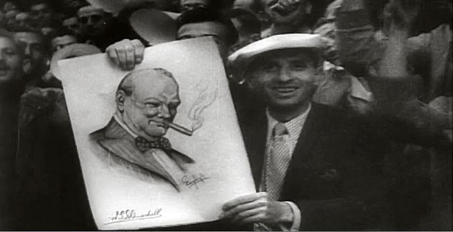 Η μορφή του άγγλου πρωθυπουργού, Ουίνστον Τσώρτσιλ, φιγουράρει σε μεγάλο χαρτί, προφανώς σχεδιασμένη από τον έλληνα που περήφανος το κρατά, και το επιδεικνύει, γεμάτος χαρά, στους εγγλέζους.