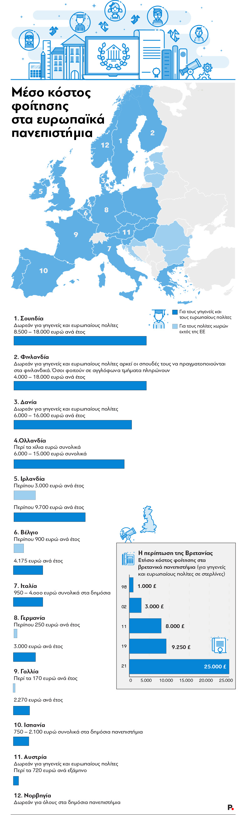 Γιατί σύμφωνα με τις προθέσεις της βρετανικής κυβέρνησης τα δίδακτρα για τους φοιτητές από χώρες-μέλη της Ευρωπαϊκής Ενωσης πρόκειται σύντομα να αυξηθούν από τις 9.250 στερλίνες (τόσα όσα πληρώνουν σήμερα και οι βρετανοί φοιτητές) στις 25.000 στερλίνες τον χρόνο, σχεδόν 30.000 ευρώ, ποσό που καταβάλλει η πλειονότητα των αλλοδαπών φοιτητών από χώρες εκτός της ΕΕ που σπουδάζουν στη Βρετανία.