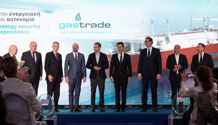 Μία ενεργειακή πύλη για την Ελλάδα, τα Βαλκάνια και τη νοτιοανατολική Ευρώπη αποτελεί ο νέος τερματικός σταθμός Υγροποιημένου Φυσικού Αερίου (LNG) στην Αλεξανδρούπολη, είπε ο Κυριάκος Μητσοτάκης κατά την ομιλία του στην τελετή για την επίσημη έναρξη υλοποίησης του έργου, παρουσία του Προέδρου του Ευρωπαϊκού Συμβουλίου, Σαρλ Μισέλ, του πρωθυπουργού της Βουλγαρίας Κιρίλ Πετκόβ, του Προέδρου της Σερβίας Αλεξάντερ Βούτιτς και του πρωθυπουργού της Βόρειας Μακεδονίας, Ντιμιτάρ Κοβατσέβσκι.