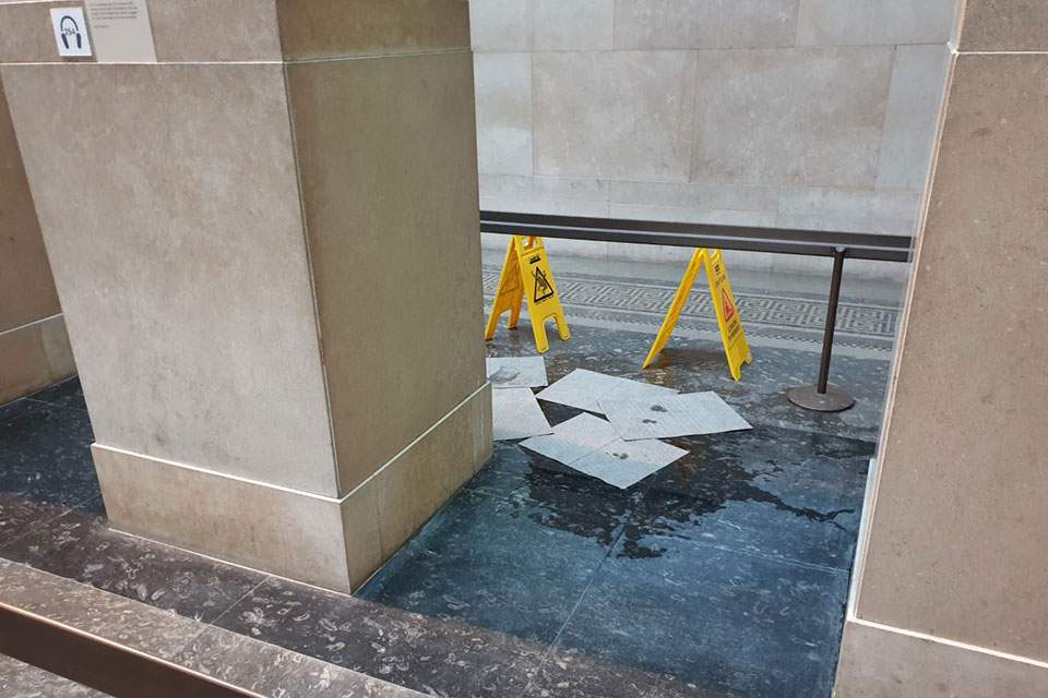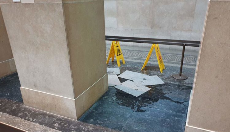 Νερά στάζουν από τη γυάλινη οροφή της αίθουσας Duveen του Βρετανικού Μουσείου, δίπλα ακριβώς στο σημείο όπου βρίσκονται τα Γλυπτά του Παρθενώνα.