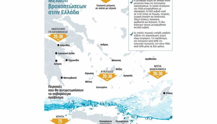 Για ορισμένα νησιά, το πρόβλημα της ανομβρίας επιτείνεται από τη σημαντική αύξηση στην κατανάλωση. «Εδώ και δύο χρόνια αντιμετωπίζουμε πρόβλημα επάρκειας νερού, λόγω της ανομβρίας και της υφαλμύρινσης των υπογείων υδάτων. Το πρόβλημα είναι εντονότερο στη νότια Ρόδο, όπου μέσα σε δύο χρόνια έχει διπλασιαστεί η κατανάλωση επειδή αυξήθηκαν οι τουριστικές κλίνες», λέει ο διευθυντής της ΔΕΥΑ Ρόδου, Αλέξανδρος Μανωλάκης. «Ναι, ανησυχούμε. Προκηρύξαμε έναν διαγωνισμό για νέες γεωτρήσεις στη νότια Ρόδο, δυστυχώς όμως δεν θα προλάβουμε να τις ολοκληρώσουμε μέσα στο καλοκαίρι και εντέλει δεν γνωρίζουμε αν θα βρούμε νερό εκεί όπου υπέδειξε η μελέτη. Εδώ και χρόνια ζητάμε από την πολιτεία να χρηματοδοτήσει τη σύνδεση της νότιας Ρόδου με το φράγμα Γαδουρά, χωρίς ανταπόκριση. Εχουμε στα χέρια μας και μια μελέτη για αφαλάτωση, αλλά δεν μπορούμε να προχωρήσουμε αν δεν γνωρίζουμε τι θα γίνει με το φράγμα».