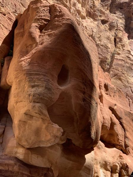 Ξεκινάμε τη διαδρομή με τα πόδια. Εύκολη διαδρομή. Συναρπαστική. Σε τραβάει η ομορφιά, το δέος. Για αυτή την πόλη με τη μακρά Ιστορία, που πήρε τη μορφή που έχει σήμερα τον 1ο αιώνα μ.Χ. Λαξευμένη σε δυσθεώρητους βράχους, ψαμμιτικών πετρωμάτων, μια ροδοκόκκινη ατμόσφαιρα που σε τυλίγει και άναυδος διασχίζεις, διασχίζεις μέχρι που συναντάς το θαύμα. Θαύμα σου μοιάζει το «Θησαυροφυλάκιο» ή αλλιώς Χαζνέ Φαραούν με μια πρόσοψη 40 μέτρων, που αίφνης προβάλει.