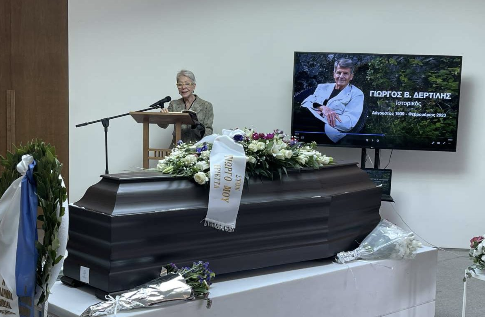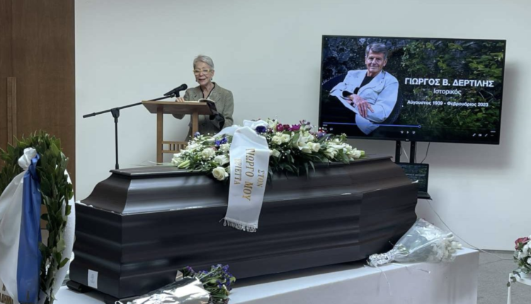 Με την μουσική από το Ρέκβιεμ του Μότσαρτ και με φωτογραφίες του στην οθόνη, αποχαιρέτησαν τον διακεκριμένο ιστορικό Γιώργο Δερτιλή η σύζυγός του Εριέττα Μαυρουδή, μέλη της οικογένειας, φίλοι και μαθητές του, την Παρασκευή 3 Μαρτίου στο Αποτεφρωτήριο της Ριτσώνας.