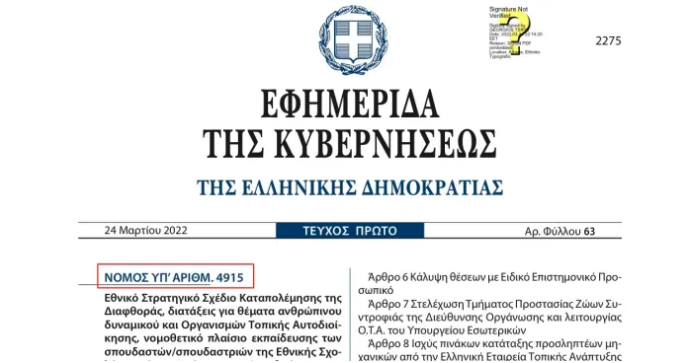 Νόμος 4915/2022 (Α΄ 63/24.03.2022) Εθνικό Στρατηγικό Σχέδιο Καταπολέμησης της Διαφθοράς, διατάξεις για θέματα ανθρώπινου δυναμικού και Οργανισμών Τοπικής Αυτοδιοίκησης, νομοθετικό πλαίσιο εκπαίδευσης των σπουδαστών/σπουδαστριών της Εθνικής Σχολής Δημόσιας Διοίκησης και Αυτοδιοίκησης για την ένταξη στον κλάδο Π.Ε. Επιτελικών Στελεχών, διατάξεις για την ολοκλήρωση της μεταφοράς των δασικών υπηρεσιών στο Υπουργείο Περιβάλλοντος και Ενέργειας, διατάξεις για την εφαρμογή του Εθνικού Σχεδίου Ανάκαμψης και Ανθεκτικότητας «Ελλάδα 2.0», Εθνική Σύνταξη Ομογενών και άλλες επείγουσες διατάξεις.