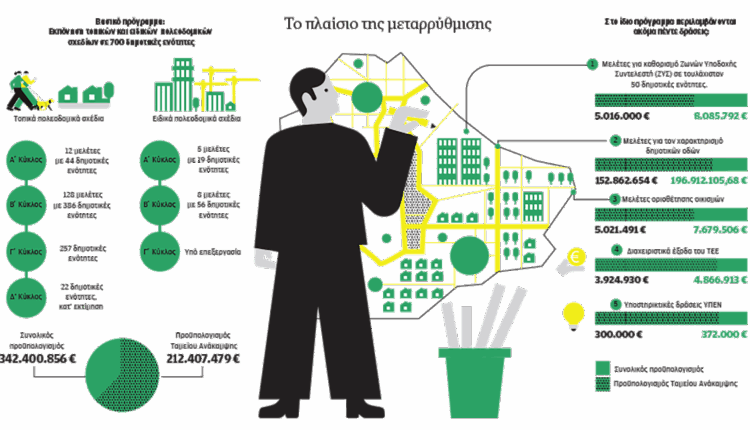Oπως είναι επόμενο, η πορεία ολοκλήρωσης των πολεοδομικών σχεδίων εκτροχιάστηκε. Το αρχικό χρονοδιάγραμμα του Ταμείου Ανάκαμψης ήταν η ανάθεση του 30% των συμβάσεων (για όλες τις παρεμβάσεις) να γίνει έως το τέλος του 2022 («ορόσημο 27»), η ανάθεση του συνόλου των συμβάσεων έως το τέλος του 2023 («ορόσημο 28»). Η τελική προθεσμία («ορόσημο 29») αφορά την έκδοση πιστοποιητικού από το υπουργείο Περιβάλλοντος έως το τέλος του 2025 ότι το πρόγραμμα ολοκληρώθηκε.
