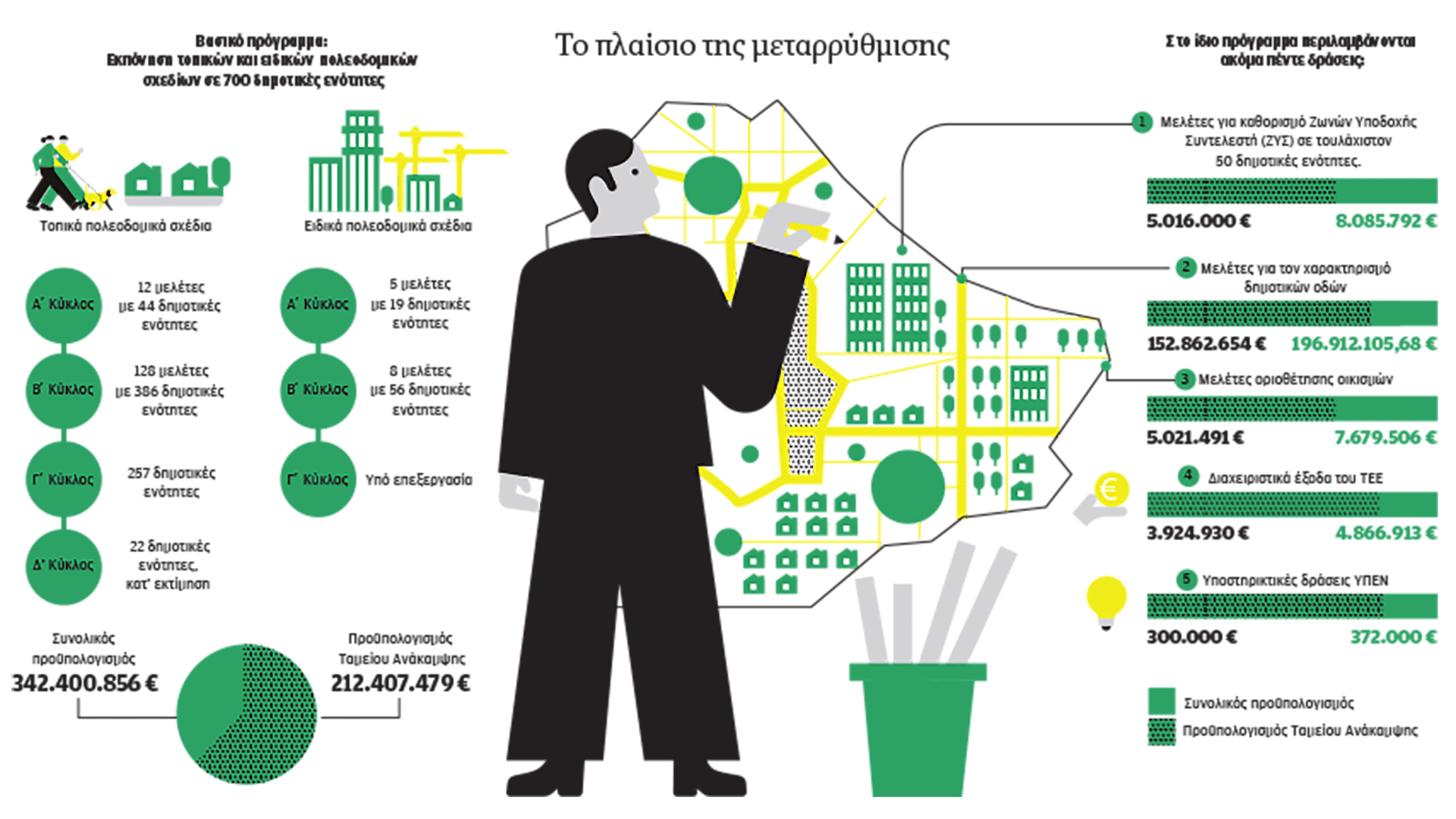 Το πρόγραμμα «Κωνσταντίνος Δοξιάδης»χωρίστηκε σε τέσσερις κύκλους και περιελάμβανε την εκπόνηση πολεοδομικών σχεδίων για 700 δημοτικές ενότητες. Στο ίδιο πρόγραμμα εντάχθηκε και η εκπόνηση 13 μελετών Ειδικών Πολεοδομικών Σχεδίων (ΕΠΣ), που αντιστοιχούν σε 75 δημοτικές ενότητες. Ο συνολικός προϋπολογισμός του έργου είναι 342,4 εκατ. ευρώ, εκ των οποίων τα 212,4 εκατ. ευρώ προέρχονται από το Ταμείο Ανάκαμψης.