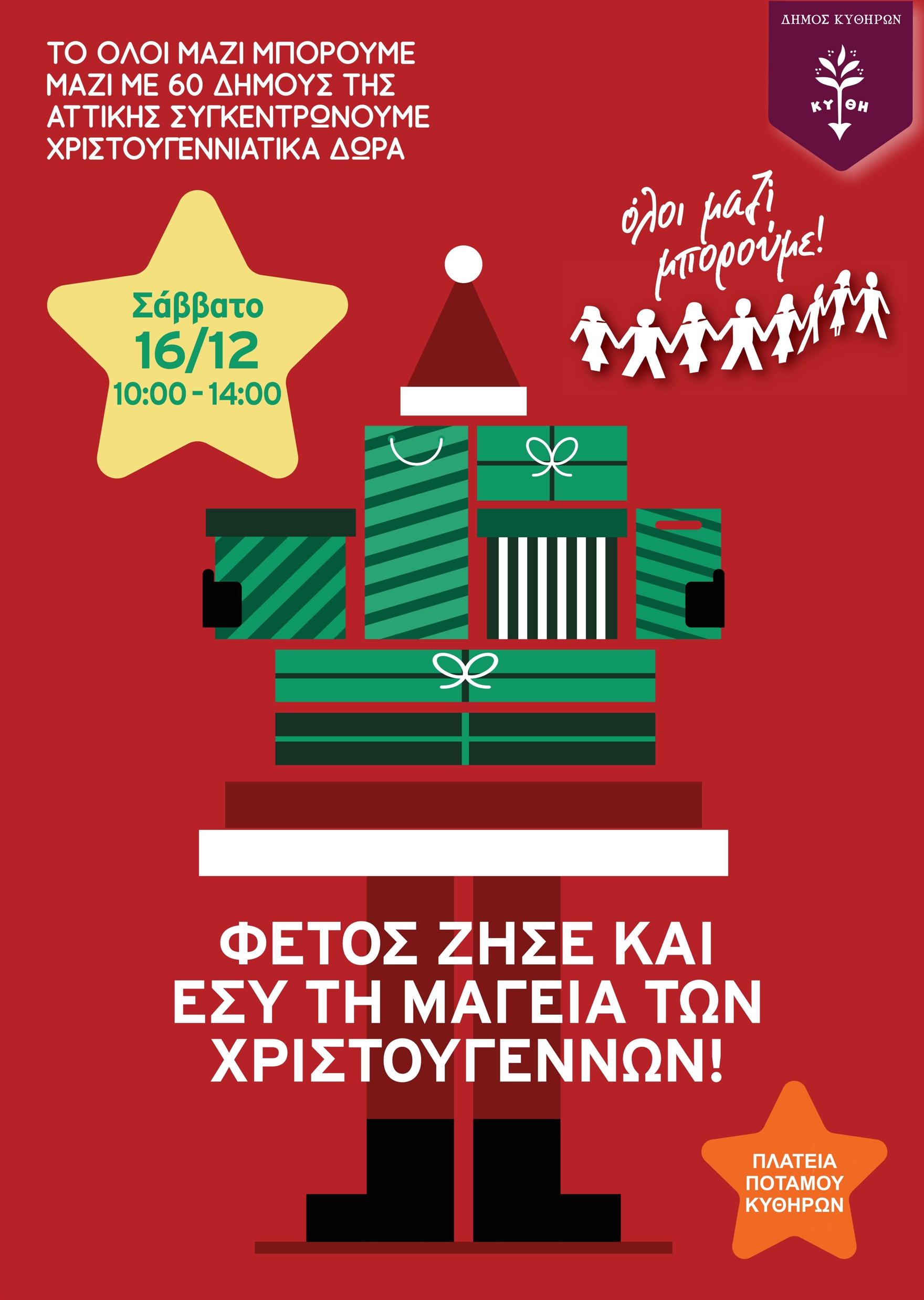 Η δράση πρόκειται να πραγματοποιηθεί στο Δήμο μας το Σάββατο, 16 Δεκεμβρίου 2023, από τις 10:00 έως τις 14:00 στην πλατεία του Ποταμού.