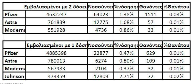Τα ποσοστά στους θανάτους εμβολιασμένων με δύο ή έστω με μία δόση, κινούνται ελάχιστα πάνω από το μηδέν (από 0,03% εως 0,01%) και σε καμία περίπτωση δεν μπορούν να συγκριθούν με εκείνα στις κατηγορίες των ανεμβολίαστων συμπολιτών μας, που έχασαν την ζωή τους πριν ή μετά την παρασκευή των εμβολίων.