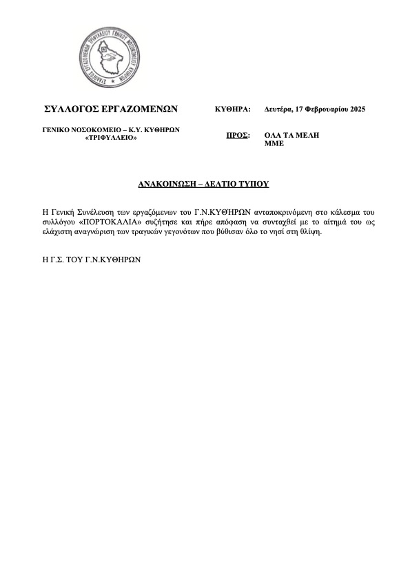 - Σύλλογος Εργαζομένων Νοσοκομείου Κυθήρων – Ανακοινώσεις
