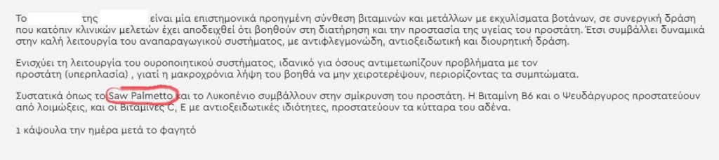 Χαρακτηριστικό είναι το παράδειγμα του εκχυλίσματος Saw Palmetto, που προωθείται ως «πανάκεια» για την «καλή λειτουργία του προστάτη» σχεδόν από το σύνολο των σκευασμάτων. Το εν λόγω εκχύλισμα βρίσκεται σε διαδικασία αξιολόγησης για την έγκρισή του. Κάτι που σημαίνει ότι έχουν κατατεθεί τα δεδομένα και αναμένεται η επιβεβαίωση ότι η λήψη του πραγματικά βοηθά κάποια κύτταρα του προστάτη, που ίσως σε κάποιους άντρες να μειώνουν τον όγκο του αδένα τελικά να ανακουφίζουν από το σύμπτωμα της συχνουρίας.