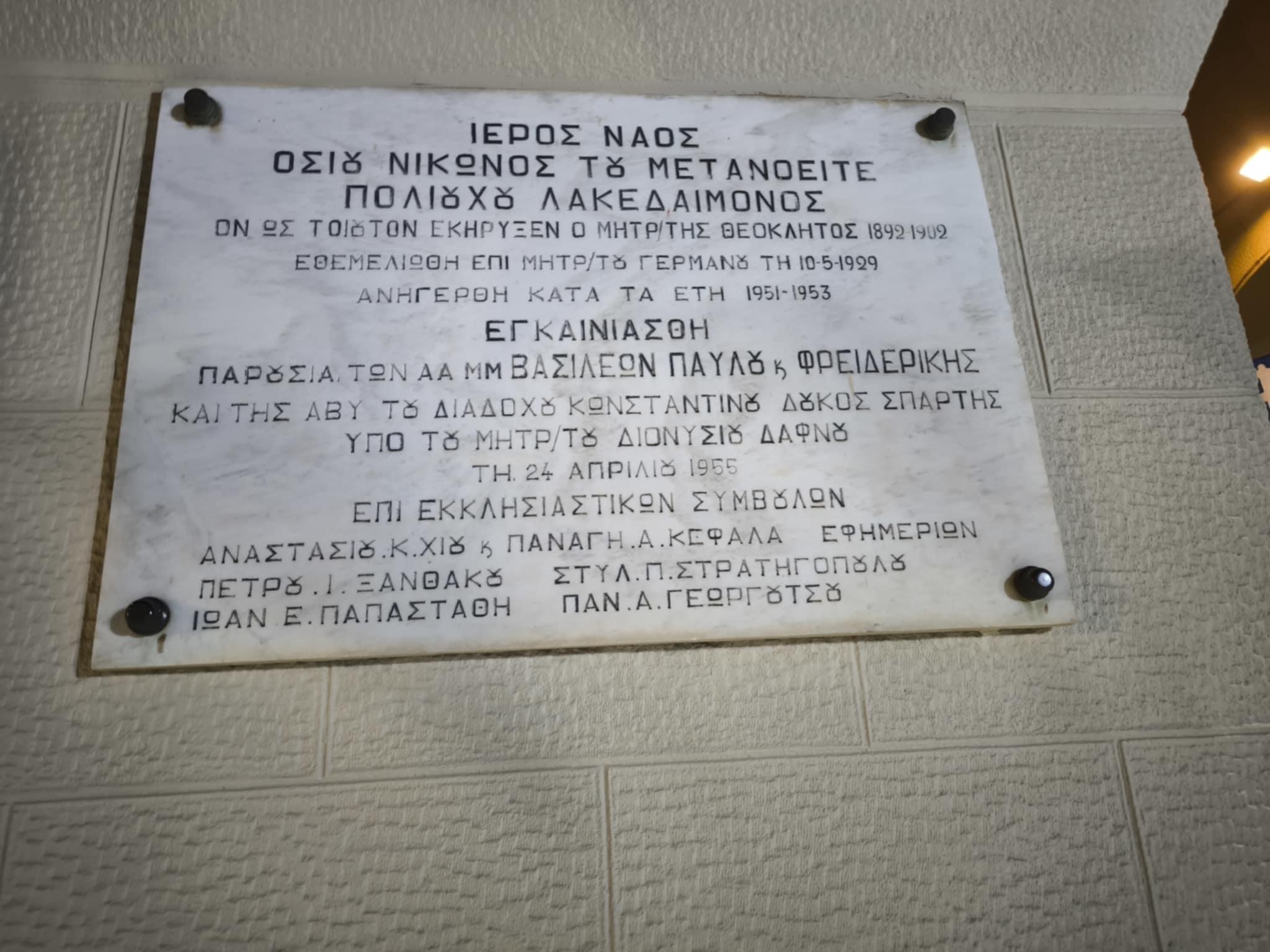 Αποχωρώντας από το Ναό του Οσίου Νίκωνος, θυμηθήκαμε τον ζακυνθινό Μητροπολίτη Διονύσιο Δάφνο, που θεμελίωσε το Ναό και διετέλεσε την περίοδο 1934-1936 και Μητροπολίτης Κυθήρων, όταν όλες οι Μητροπόλεις της Λακωνίας συγχωνεύθηκαν σε μία. Η προτομή του υπάρχει έξωθεν του Ναού Οσίου Νίκωνος, που τον εγκαινίασε ο ίδιος το 1955.