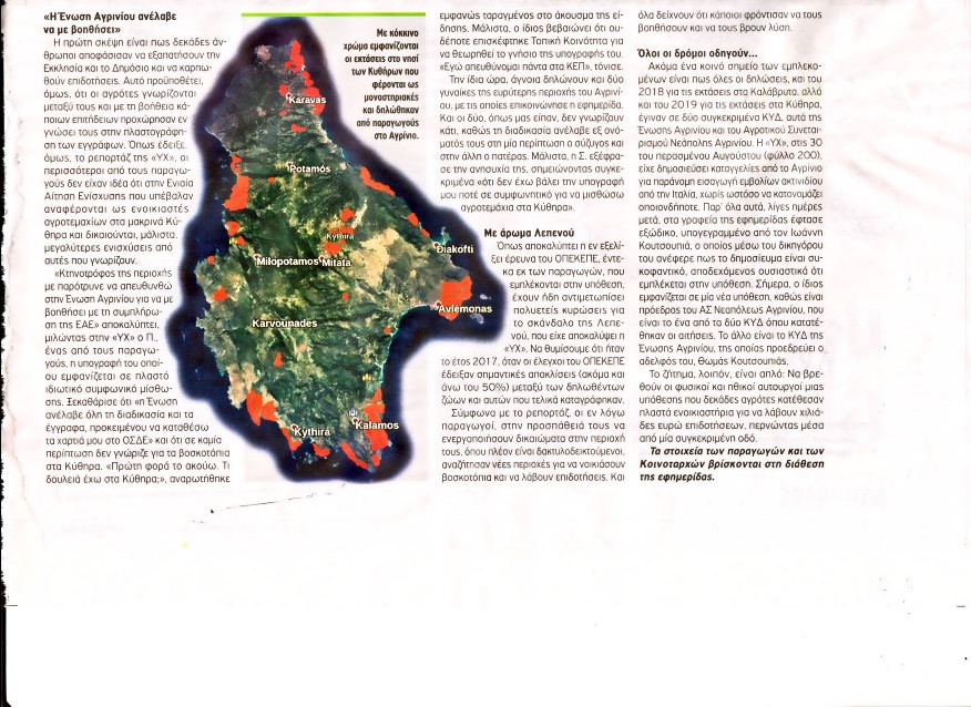 Συνεχίζεται η δημοσιογραφική έρευνα που ξεκίνησε η εφημερίδα ΥΠΑΙΘΡΟΣ ΧΩΡΑ σχετικά με τα δηλωθέντα 15.000στρ στα Κύθηρα από αγρότες του Αγρινίου, οι οποίοι, είχαν ενοικιάσει δήθεν αυτές τις εκτάσεις από μία Μονή στο Αίγιο, στην οποία οι υπεύθυνοι δεν γνώριζαν τίποτε!